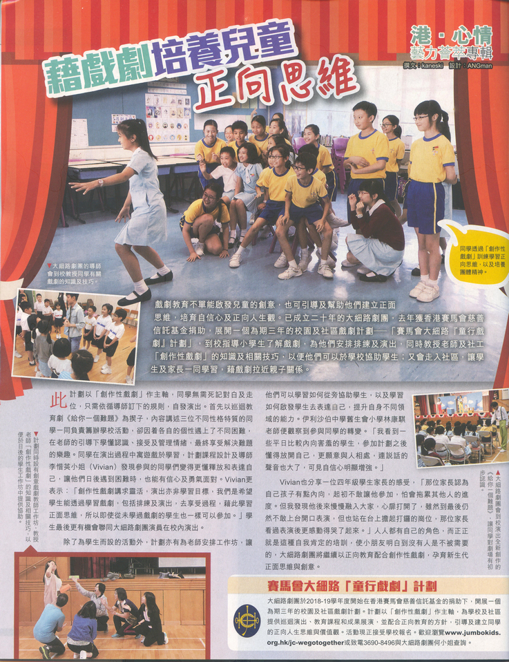 本校參加了賽馬會大細路「童行戲劇」的計劃,藉戲劇培養兒童的正向思維。