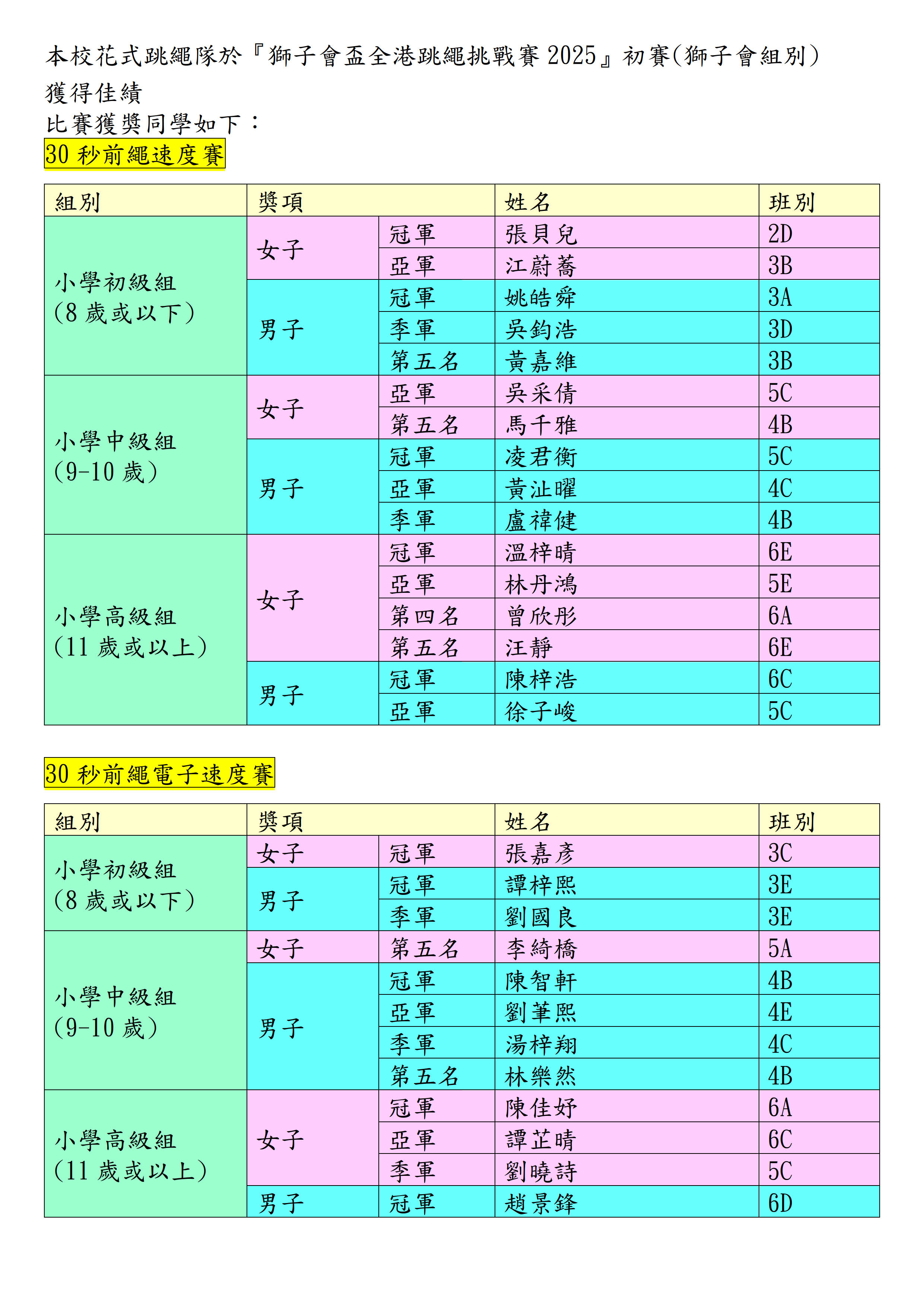 本校花式跳繩隊於『獅子會盃全港跳繩挑戰賽2025』初賽(獅子會組別) 獲得佳績