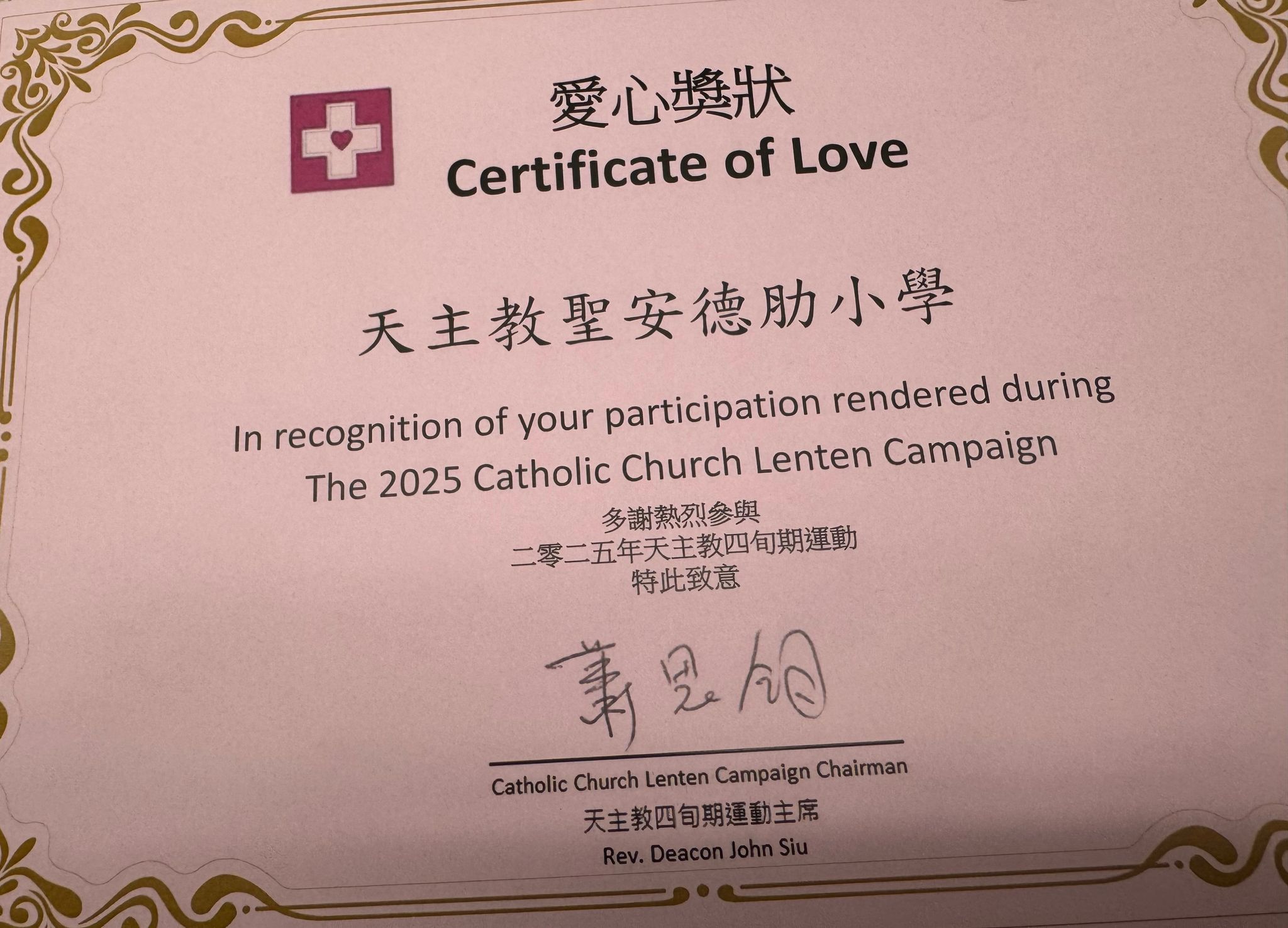 天主教四旬期運動 愛心獎狀